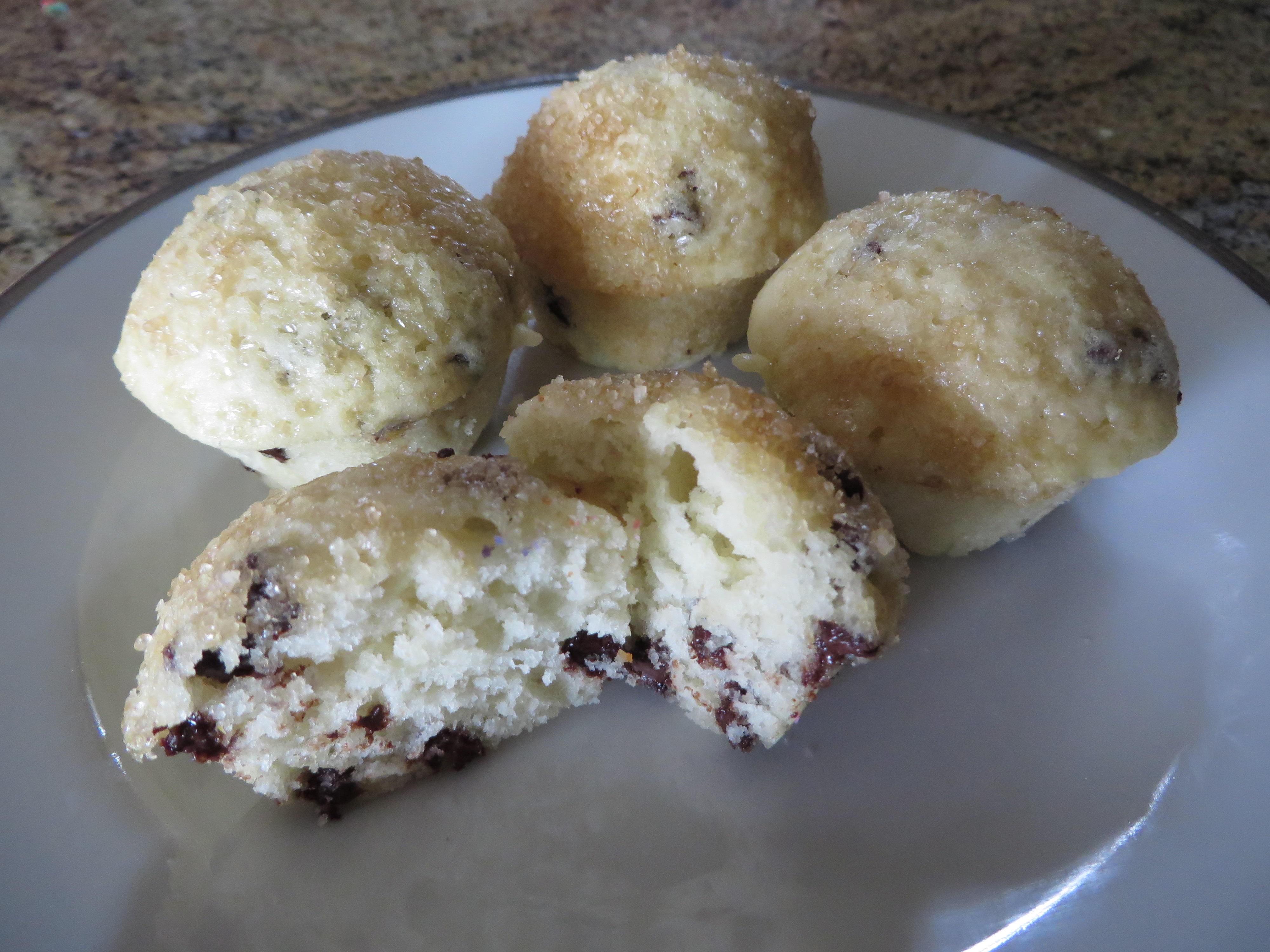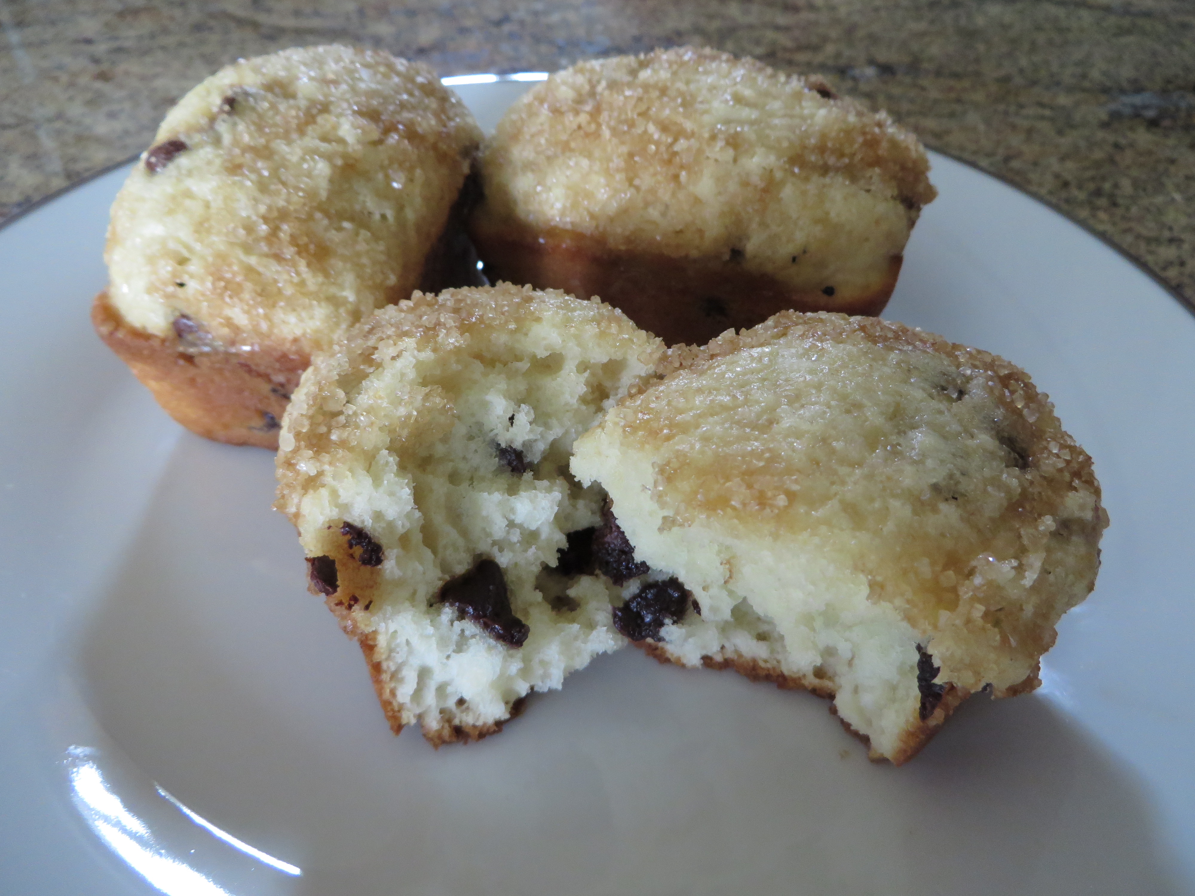 Chocolate Chip - A tender mini muffin filled with miniature semi-sweet chocolate chips and topped with coarse turbinado sugar.