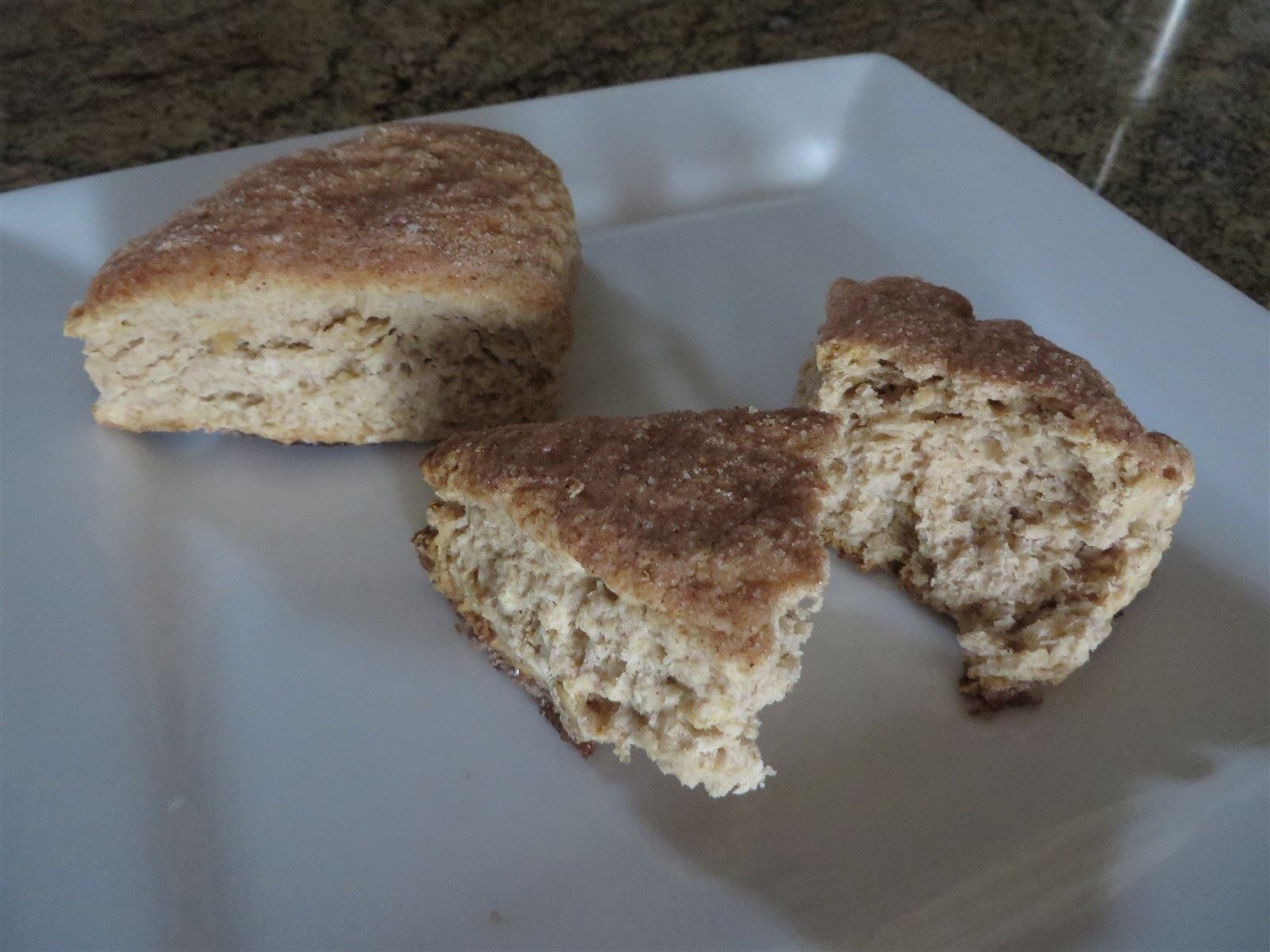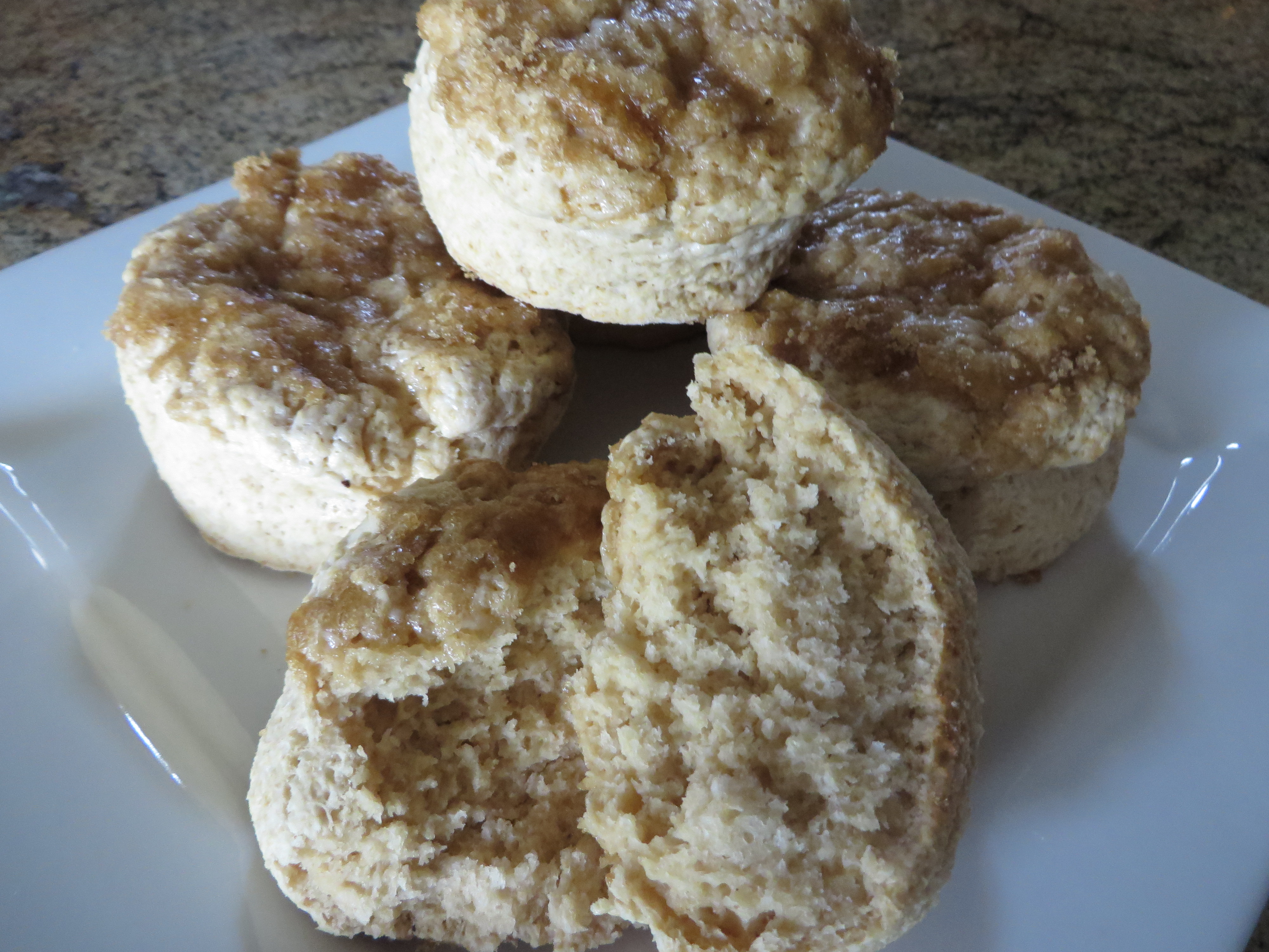 Brown Sugar Whole Wheat - This is a scone made with brown sugar instead of traditional white sugar - the taste is noticeable and very good. They're topped with a brown sugar mixture that makes a sugar-y 'crust' on top as they bake which adds a sweetness not found in other scones.
