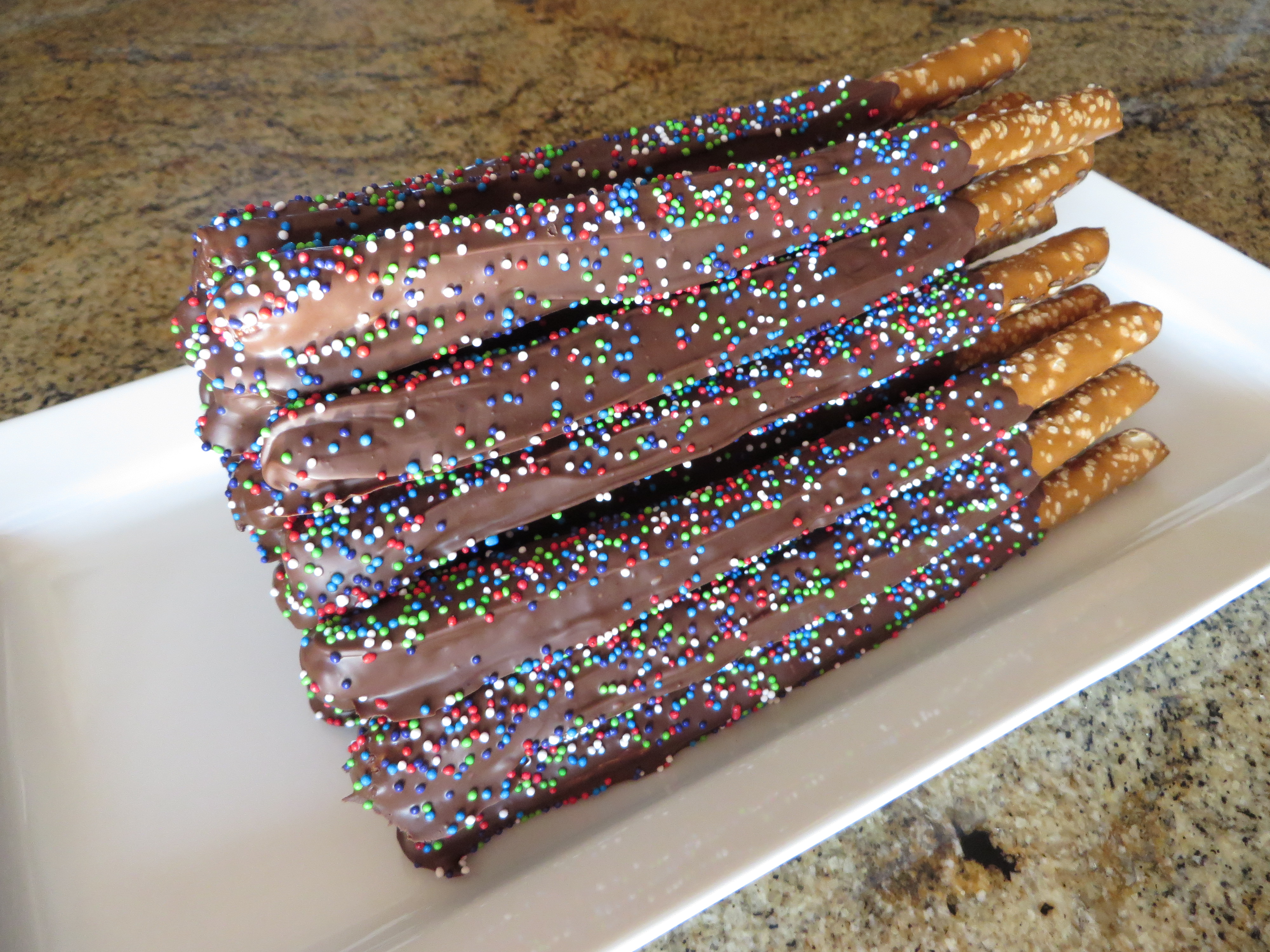 Candy Coated Pretzel Rods - We dip pretzel rods in your choice of chocolate, colored candy coating or caramel, then dredge it in your choice of sprinkles, coconut, candy bits or cookie crumbles.