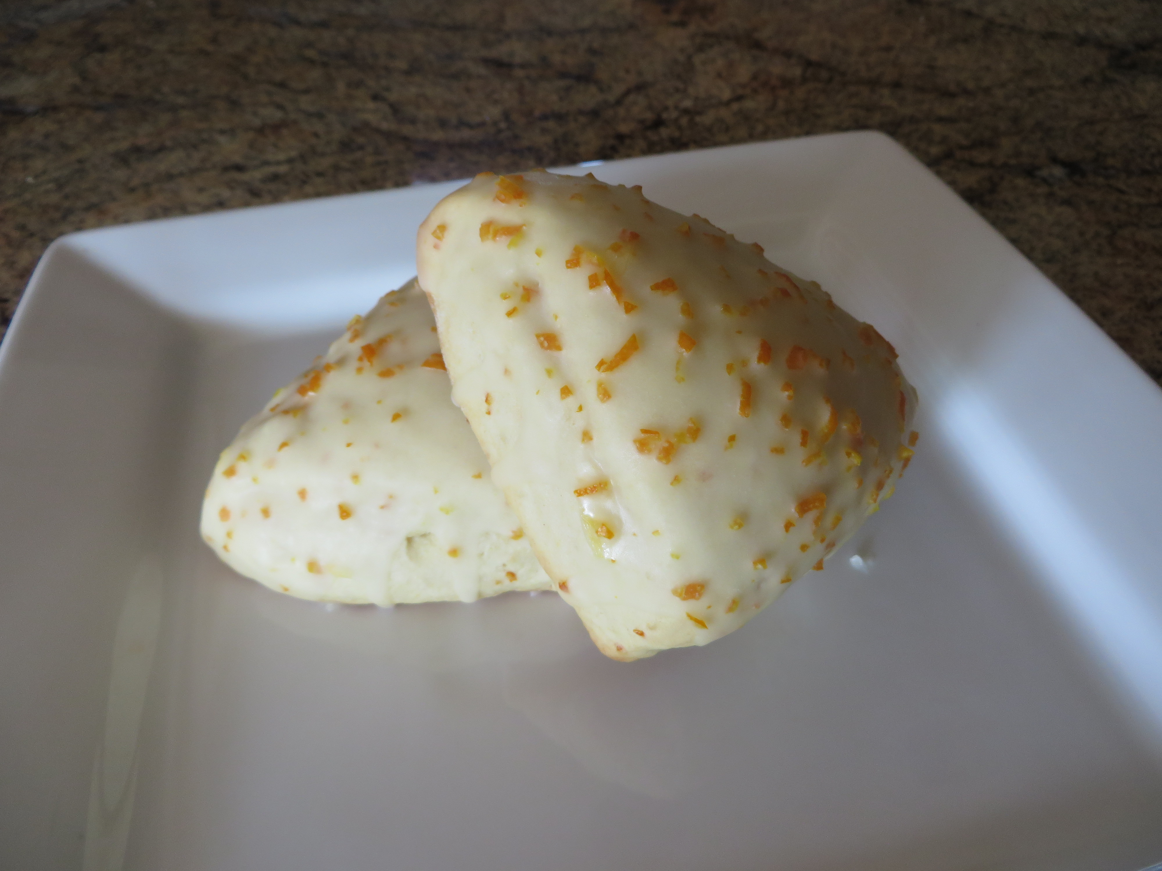 Orange - Just like our Lemon Scones, we make these with fresh juice and zest and glaze them with the same ingredients. They have an incredibly fresh - not artificial - orange flavor. Very tasty.