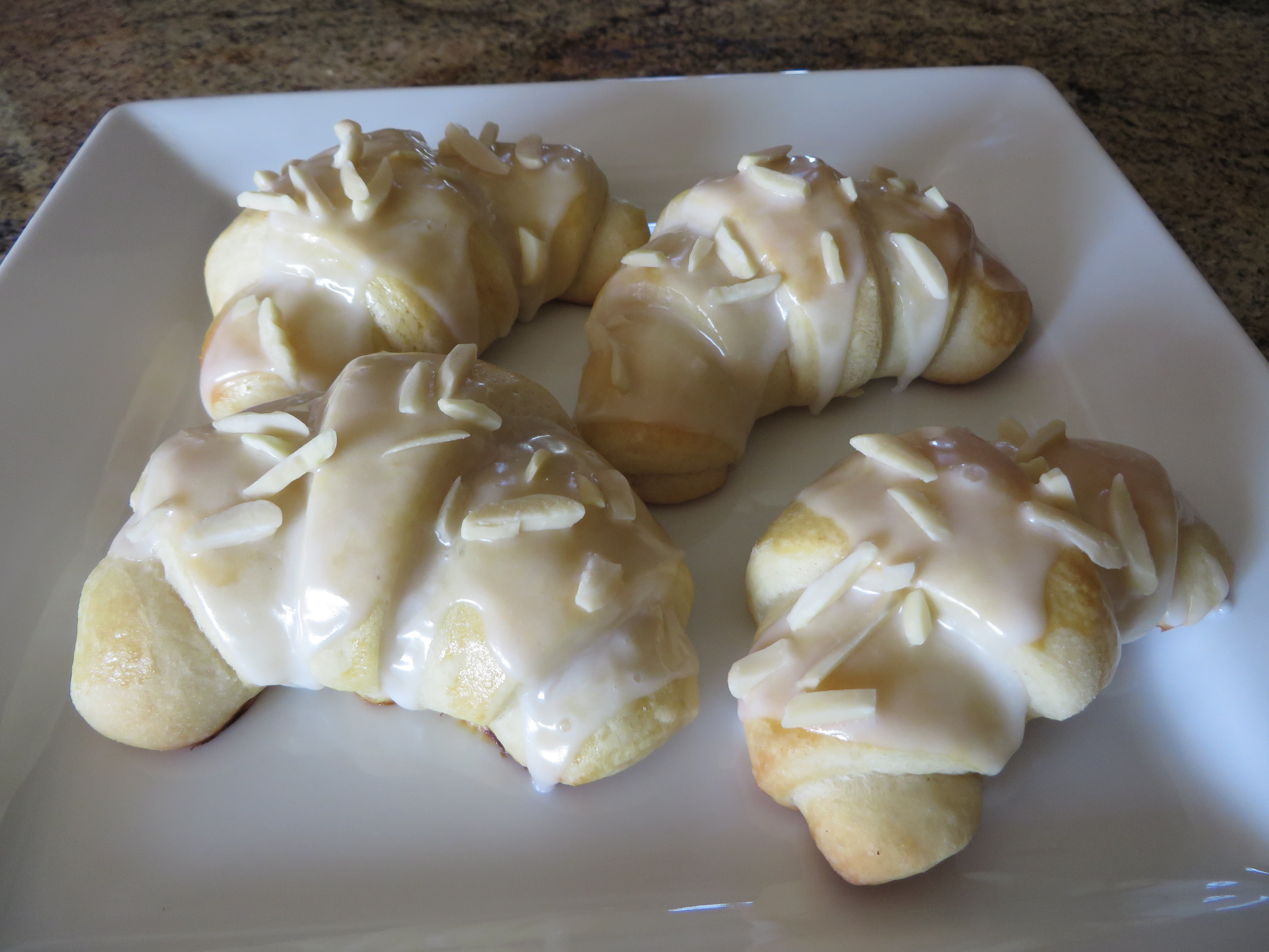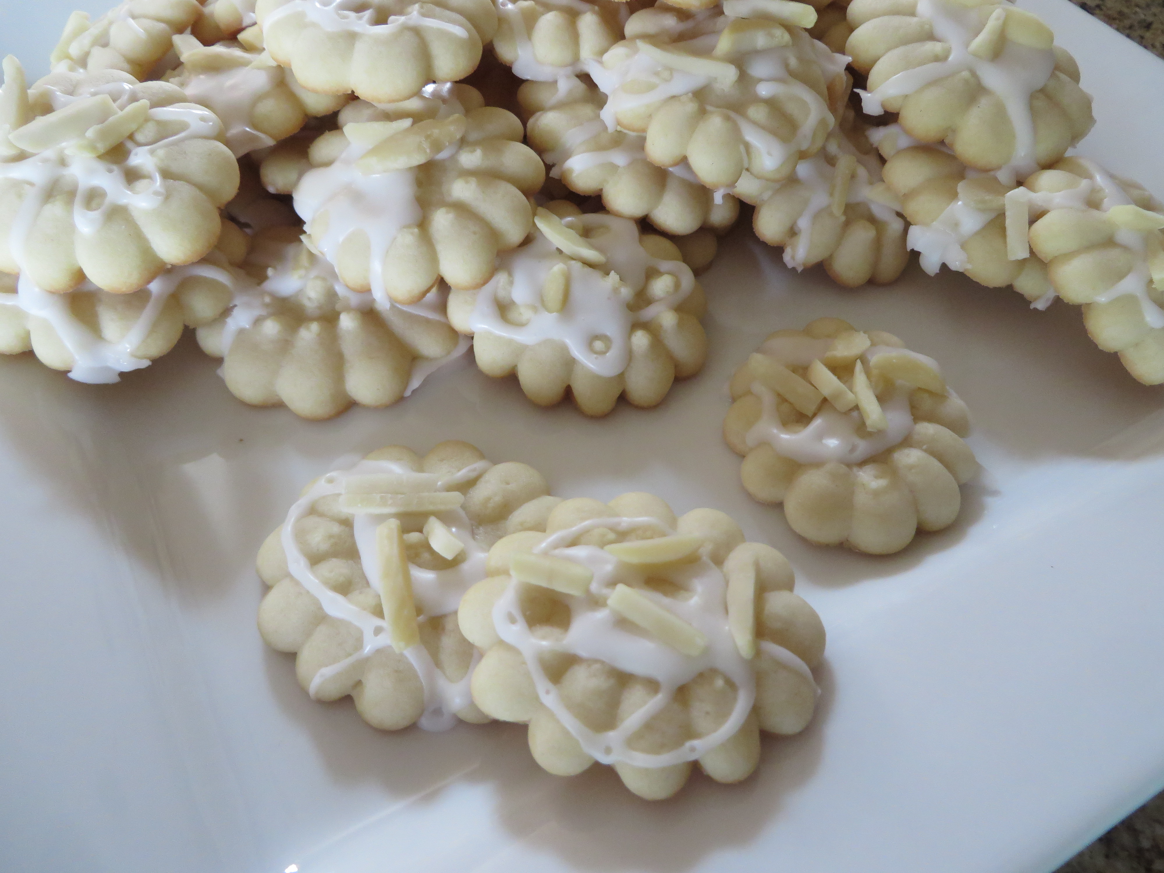 Almond Spritz - These are a small delicate cookie flavored with almond then glazed with an almond glaze, finished off with crunchy slivered almonds; the perfect contrast in textures. Great with a cup of coffee.