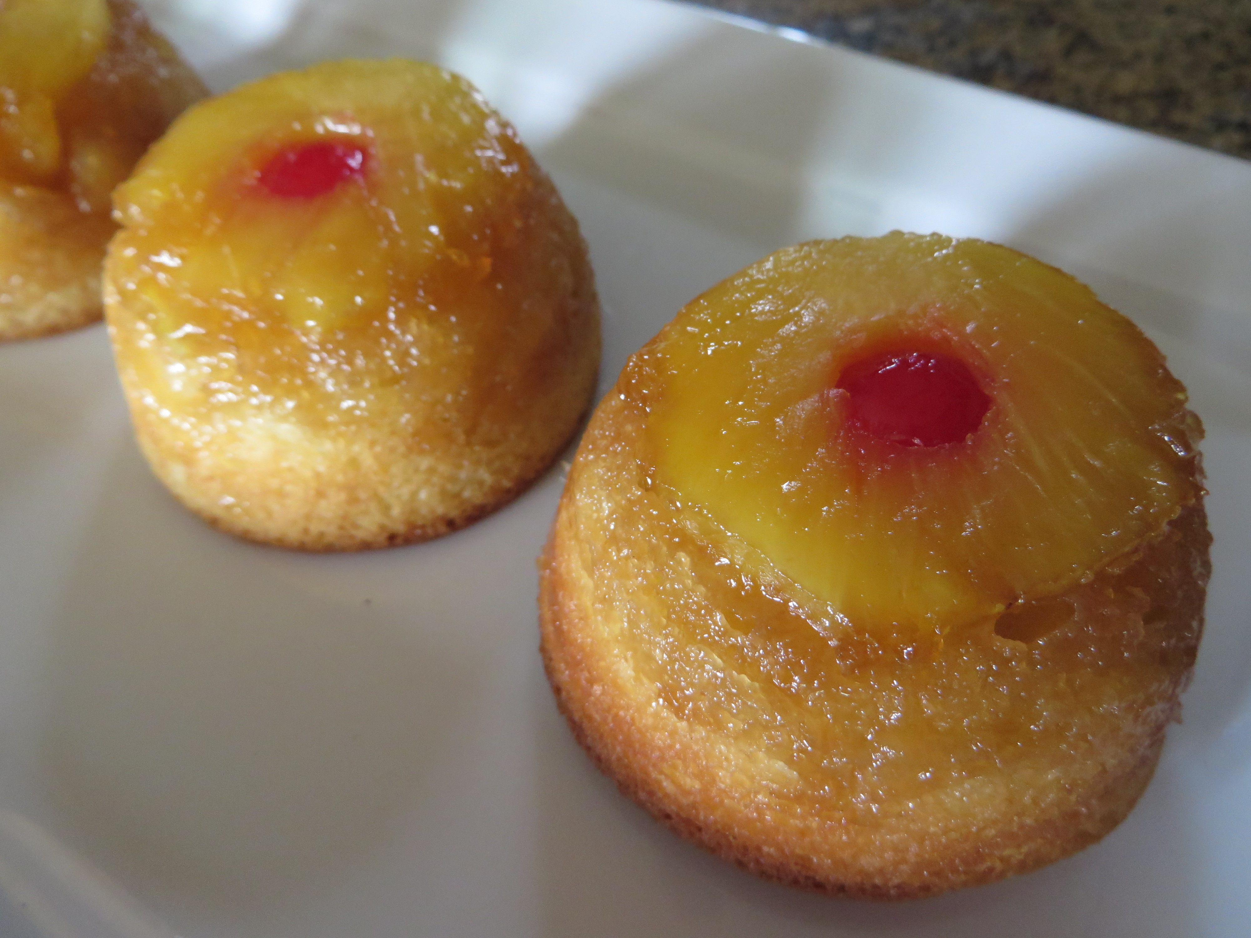 Pineapple Upside Down - Delicious little cakes that are just the right size. We actually cut fresh pineapple ourselves, so it just fits into the pans and gives a perfect Upside-Down Cake 'look' for your event. Can be topped with stabilized whipped cream on request.