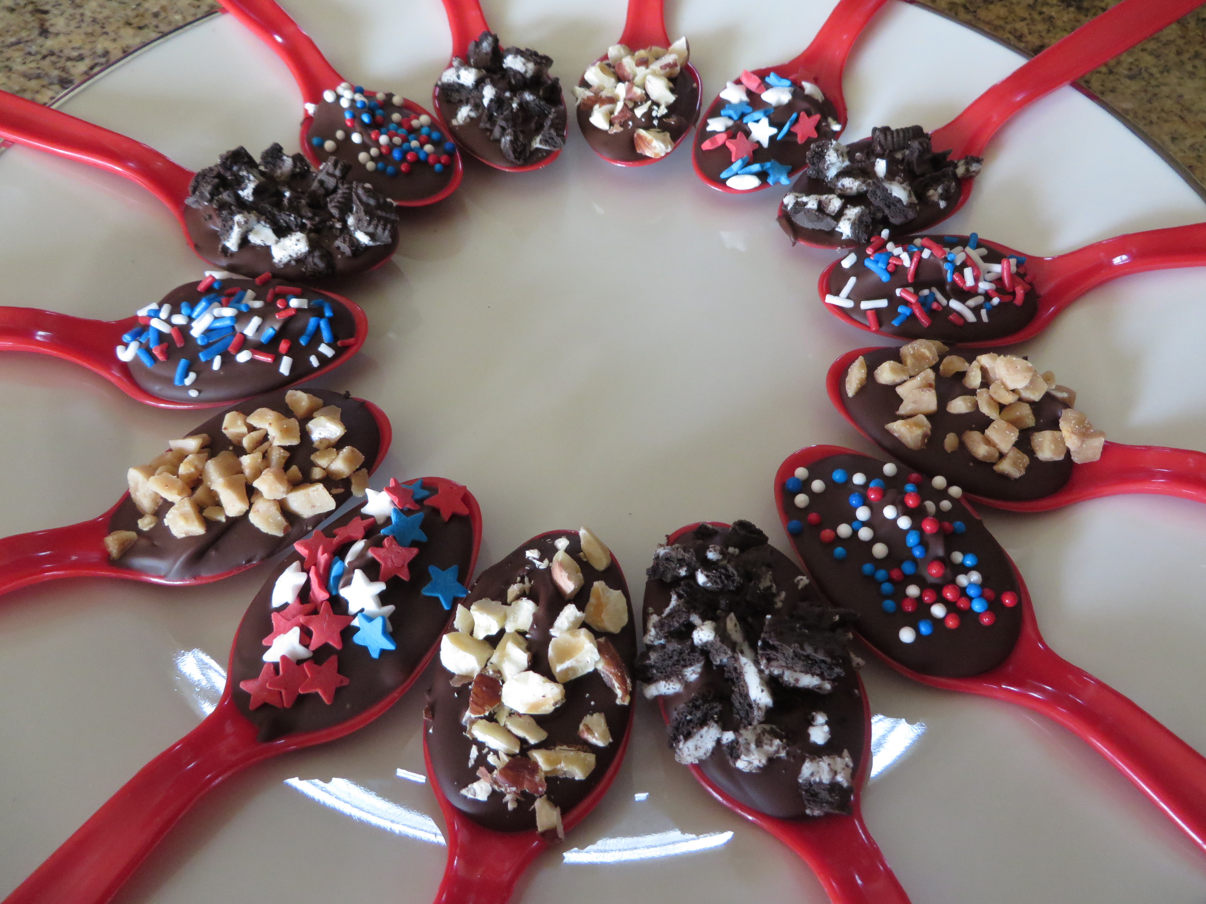 Ganache Spoons - You choose from a variety of disposable plastic spoons that match your theme, then we make a rich ganache and fill the spoons; finally, we add whatever decoration - or toppings - that you've chosen, from simple sprinkles to chopped Oreos or toffee bits.