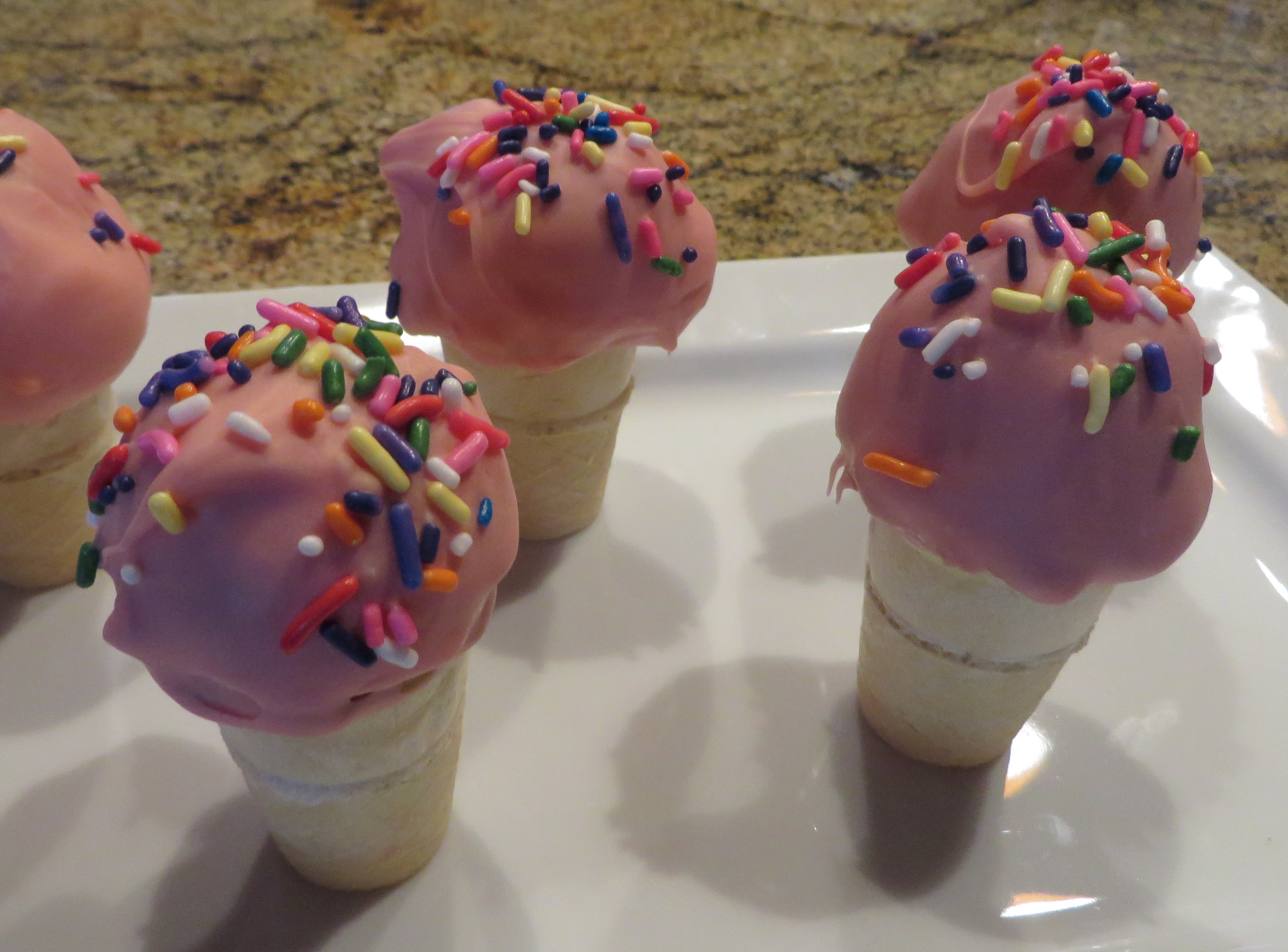 Dipped Cake or Cookie Ball Ice Cream Cones - 100% customizable; miniature Ice Cream Cones filled with Cake or Cookie Ball 'Dough' then dipped in your choice of chocolate or colored candy coating and topped with your choice of sprinkles.