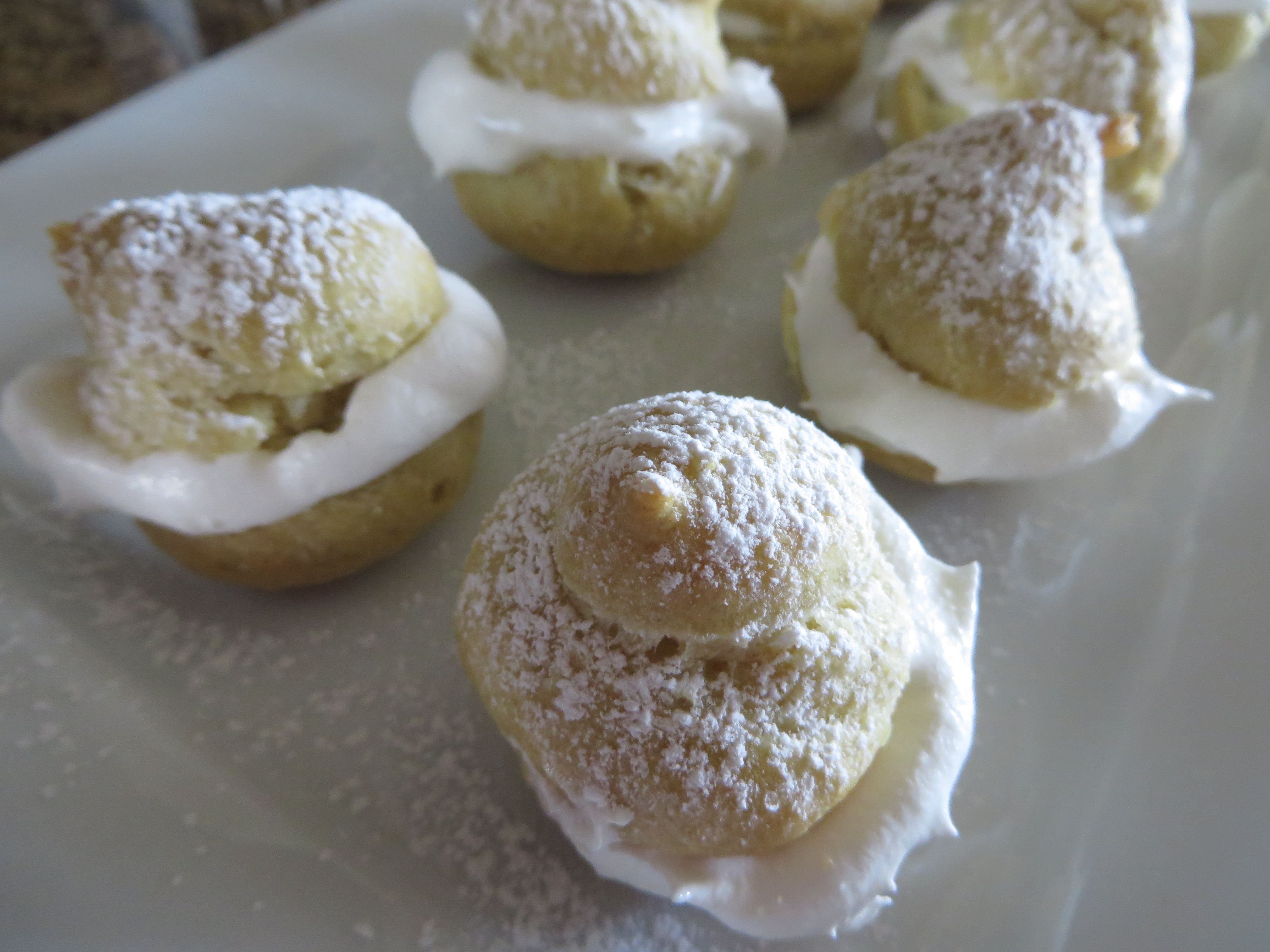 Profiteroles - Some call them Cream Puffs but either way, these are delicious little individual pastries! We make them with your choice of filling; lightly Sweetened, Stabilized Whipped Cream, Chocolate Whipped Cream, Vanilla Pastry Cream Almond Pastry Cream or a rich Custard making them similar to a St. Joseph's Day Pastry - the Italian Zeppola. To finish them off we dust them lightly with confectioner's sugar.