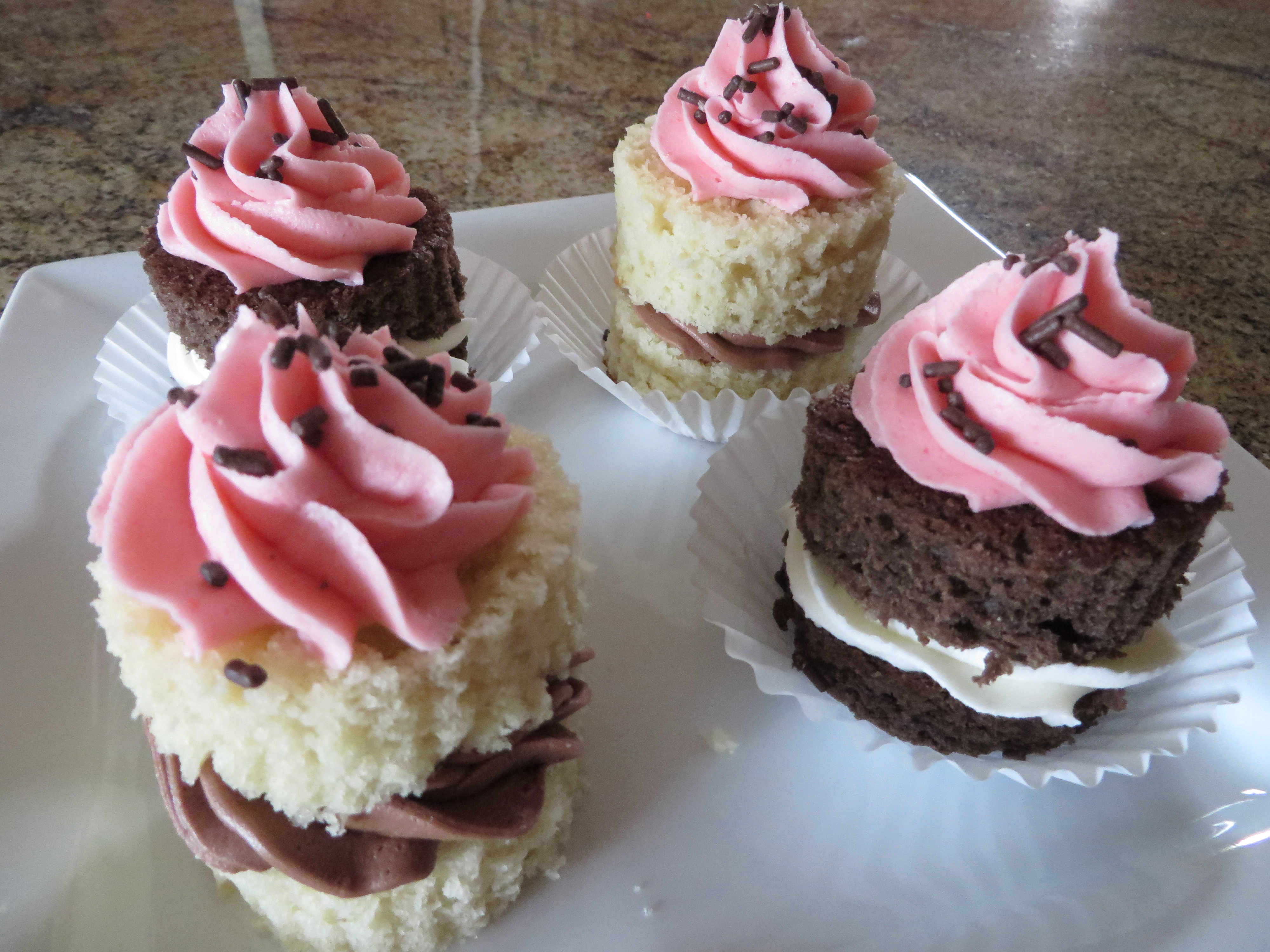 Neapolitan Mini Cakes - Your choice of either Chocolate or Vanilla Cake - two layers - with a layer of Chocolate Buttercream or a layer of Vanilla Buttercream and a layer of Strawberry Buttercream; all topped off with a little garnish of sprinkles! Very cute.