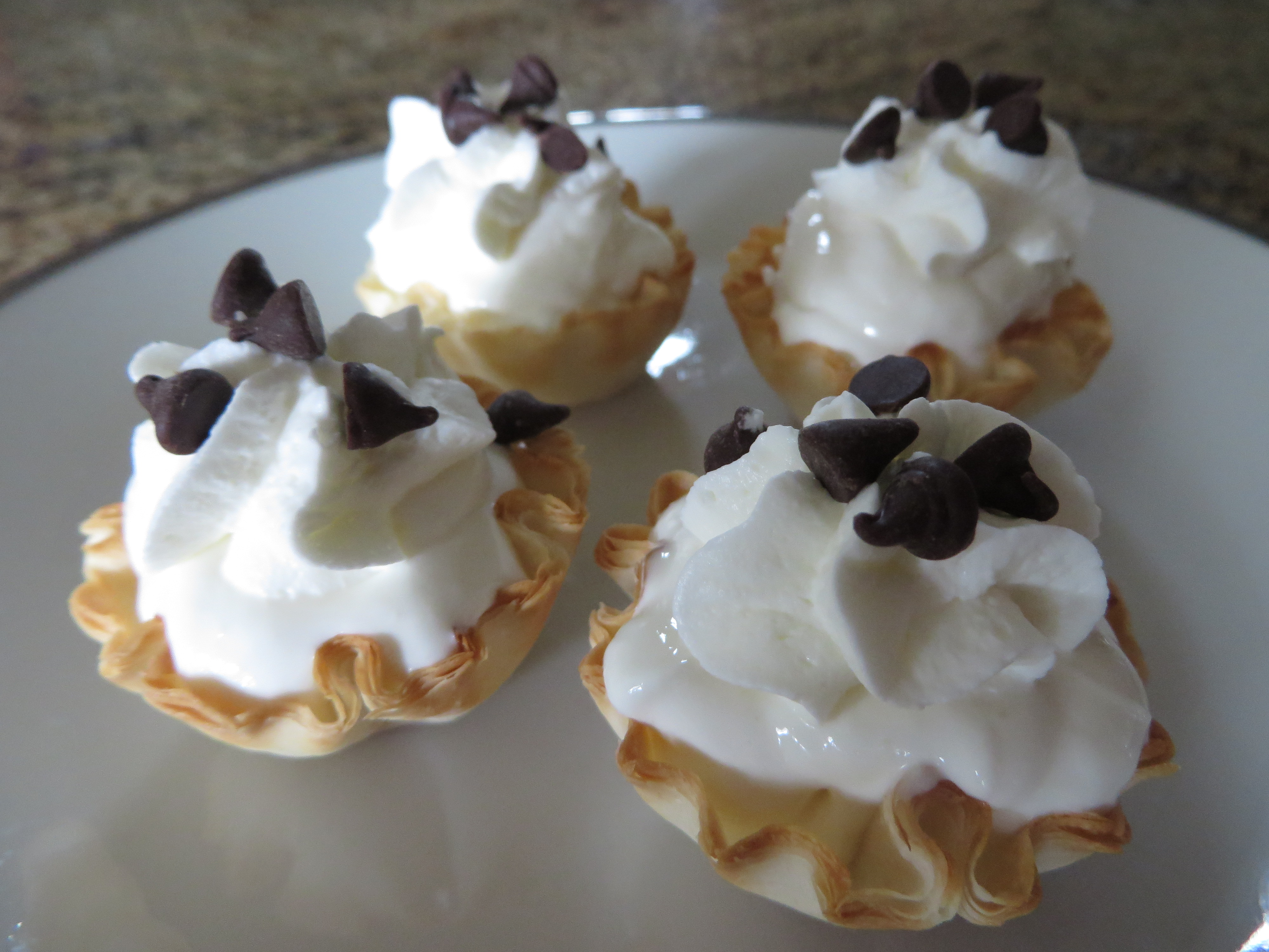 Cannoli - We make a cannoli filling and then pipe it into tart cups before garnishing it with whipped cream and mini chocolate chips.