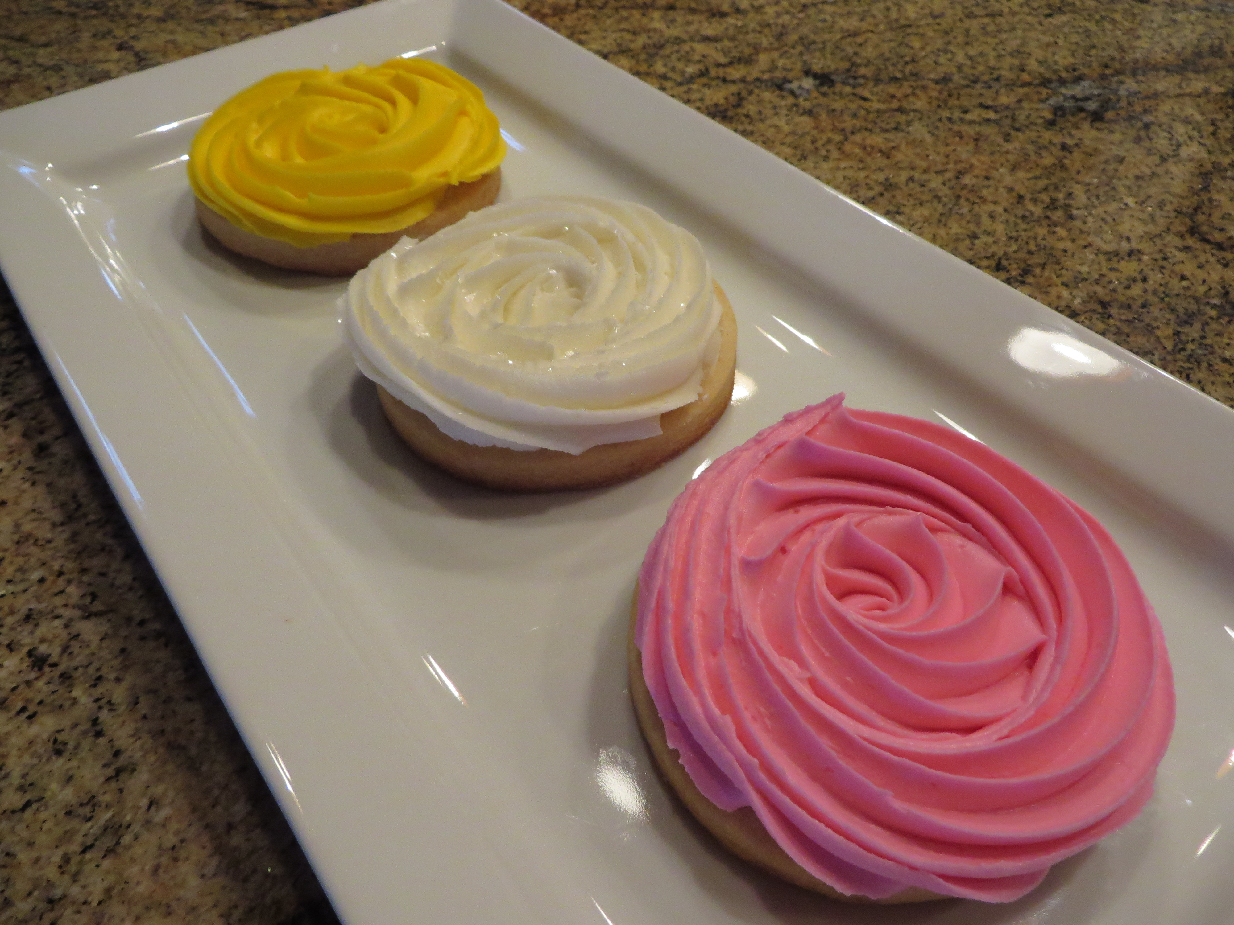Tiered Cookie Cakes*** - Thick, tender cookies layered with our Signature Cupcake Frosting in your choice of color(s); you can even add your choice of sprinkles, non-pareils or edible glitter! A very nice addition to a Wedding Dessert Buffet with snowy white frosting and shimmery edible glitter.