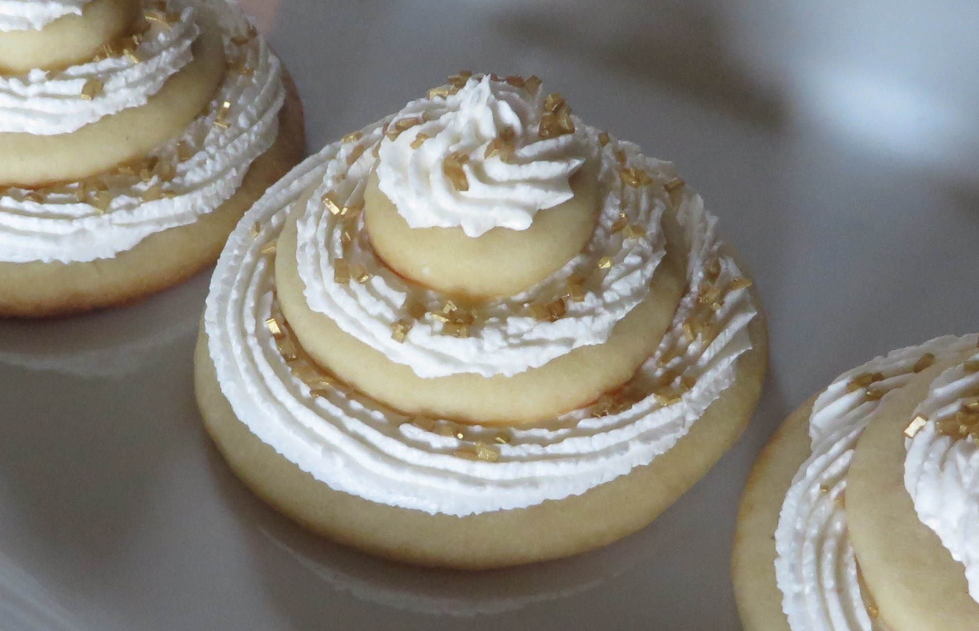 Tiered Cookie Cakes - Thick, tender cookies layered with our Signature Cupcake Frosting in your choice of color(s); you can even add your choice of sprinkles, non-pareils or edible glitter! A very nice addition to a Wedding Dessert Buffet with a snowy, white Frosting and shimmery white or silver edible glitter.