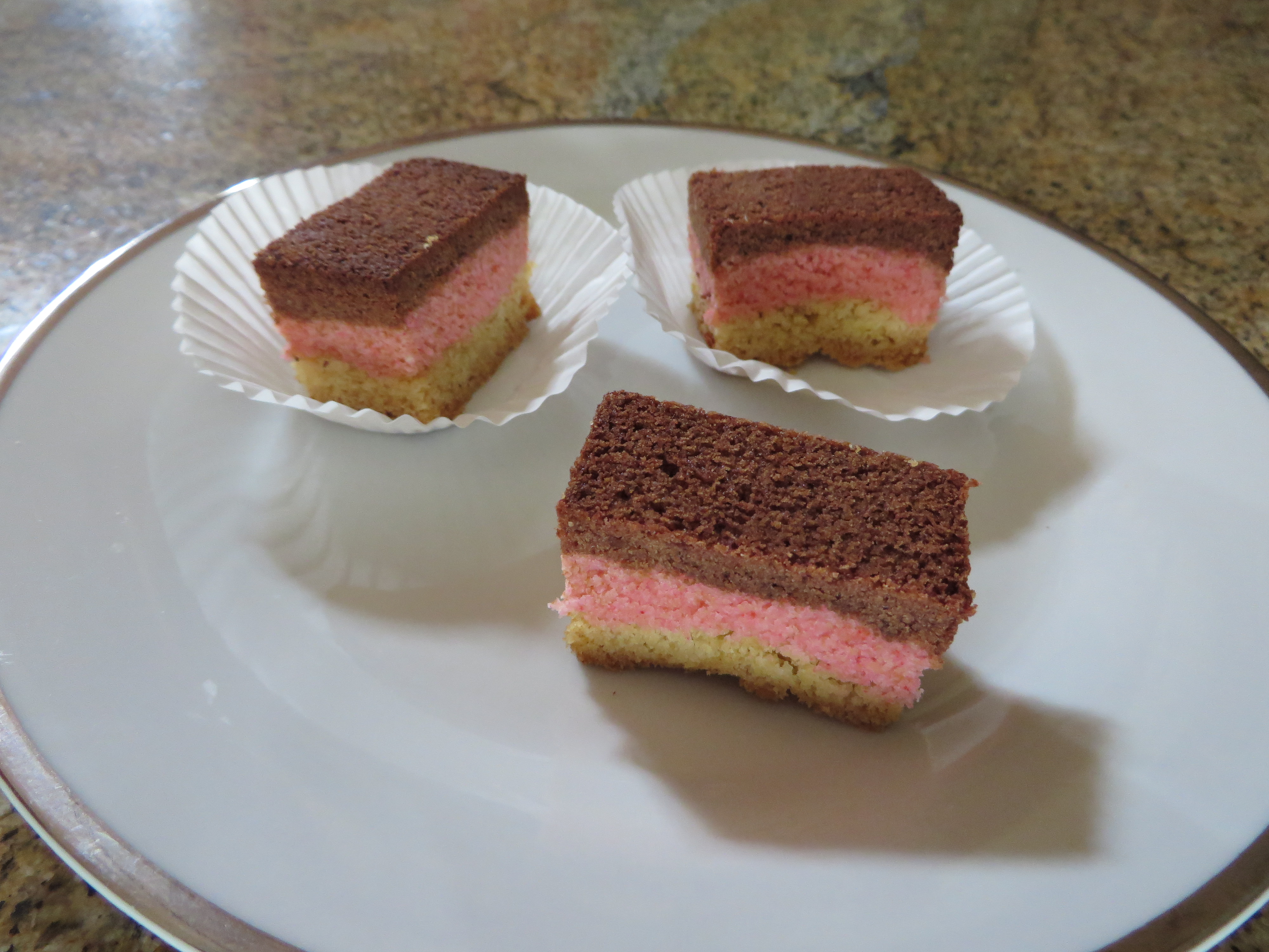 Neapolitan Cake Bars- These delicious little bite sized treat bars can be sized in one of two different ways; little 3/4-inch wide bars or as little 1 1/2-inch squares. The classic combination of chocolate, vanilla and strawberry combined with their 'pop-pability' is a deadly combination!